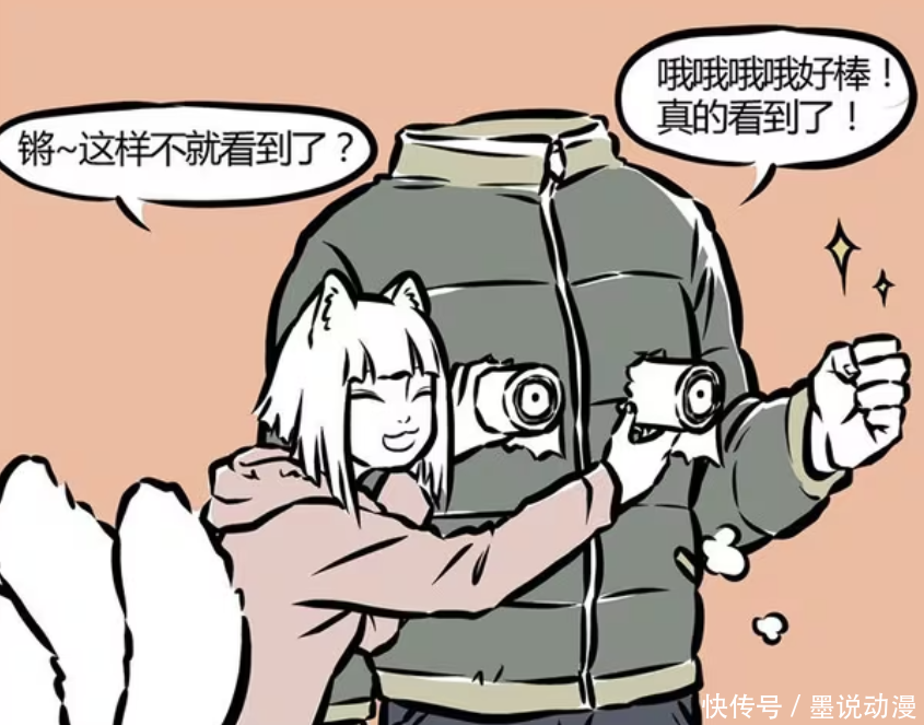 《非人哉》漫画版中,刑天因为没有头,在冬天的时候很不方便。穿上羽绒服可以御寒,但是要看不清楚路,只能将羽绒服挖两个洞。可是羽绒会跑出去,路就看不清楚。九月用纸筒帮刑天解决了这个问题。随后哮天做了升级,用潜望镜代替纸筒,让刑天可以看得更高更远。