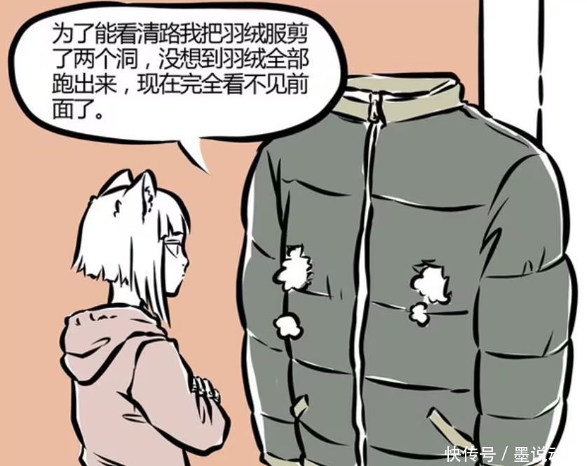 为了看清楚路,刑天将羽绒服剪了两个洞。只是剪破洞之后,羽绒就会跑出来,也会将洞堵住。这样的话,刑天还是看不清楚。虽说刑天早就使用没有头的生活,可是还是有很多不便。